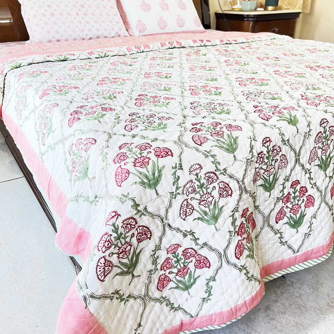 Pink Floral Block Printed Double sided Cotton Quilt - 90 inches x 108 inches