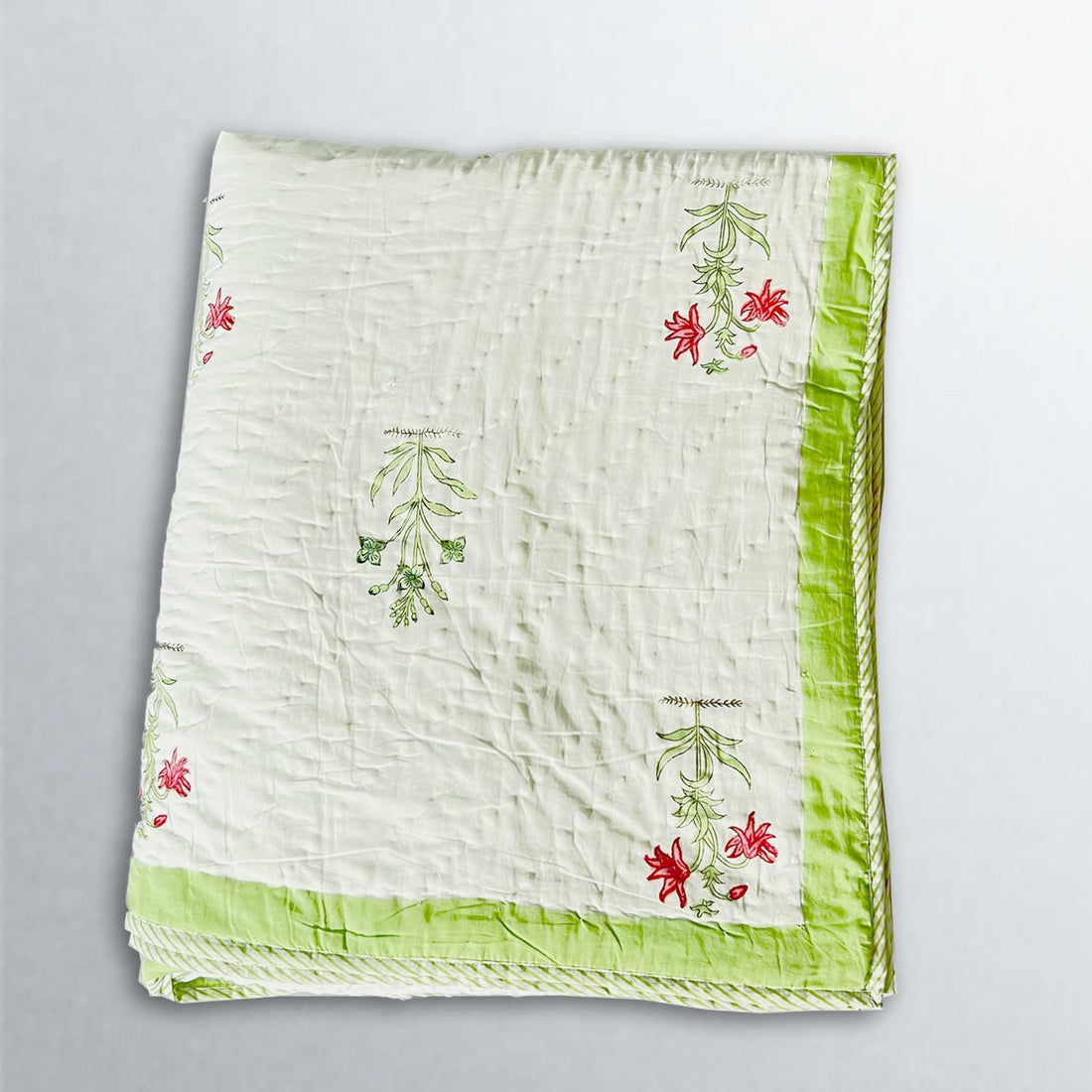 White & Green Soft Cotton Floral Printed Quilt - 90 inches x 100 inches