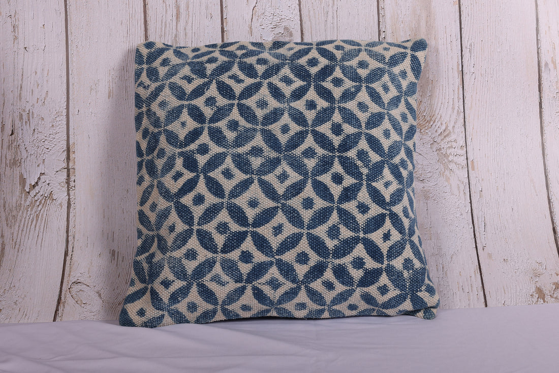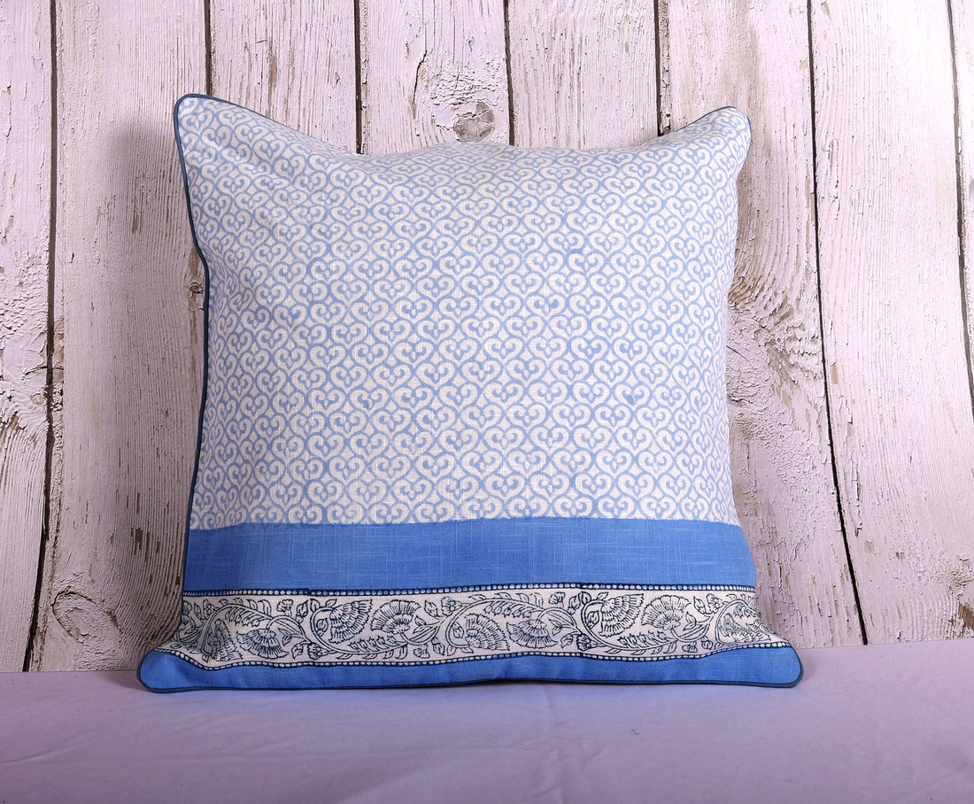 Sweetheart Blue Hand Block Printed 100% Slub Cotton Cushion Cover - 16 x 16 inches | Peacoy