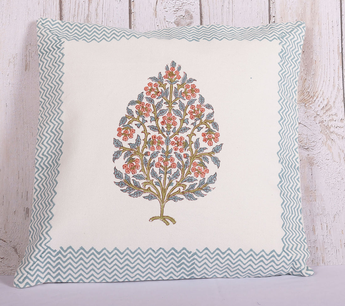 Tree Motif Hand Block Printed Cream 100% Slub Cotton Cushion Cover - 16 x 16 inches | Peacoy