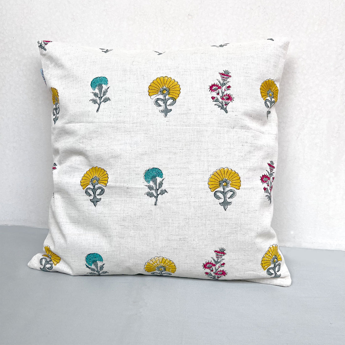 Sweet Floral Yellow Hand Block Printed 100% Slub Cotton Cushion Cover - 16 x 16 inches | Peacoy