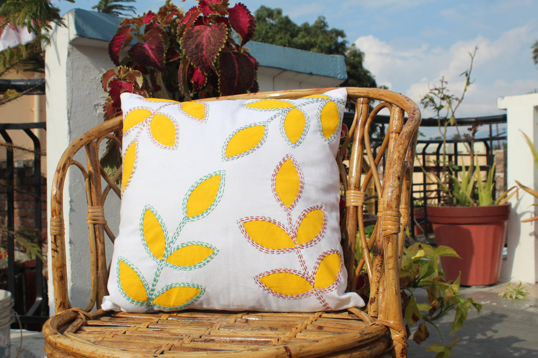 Sunshine Leaves White & Yellow 100 % Pure Cotton Cushion Cover - 16 x 16 inches | Peacoy