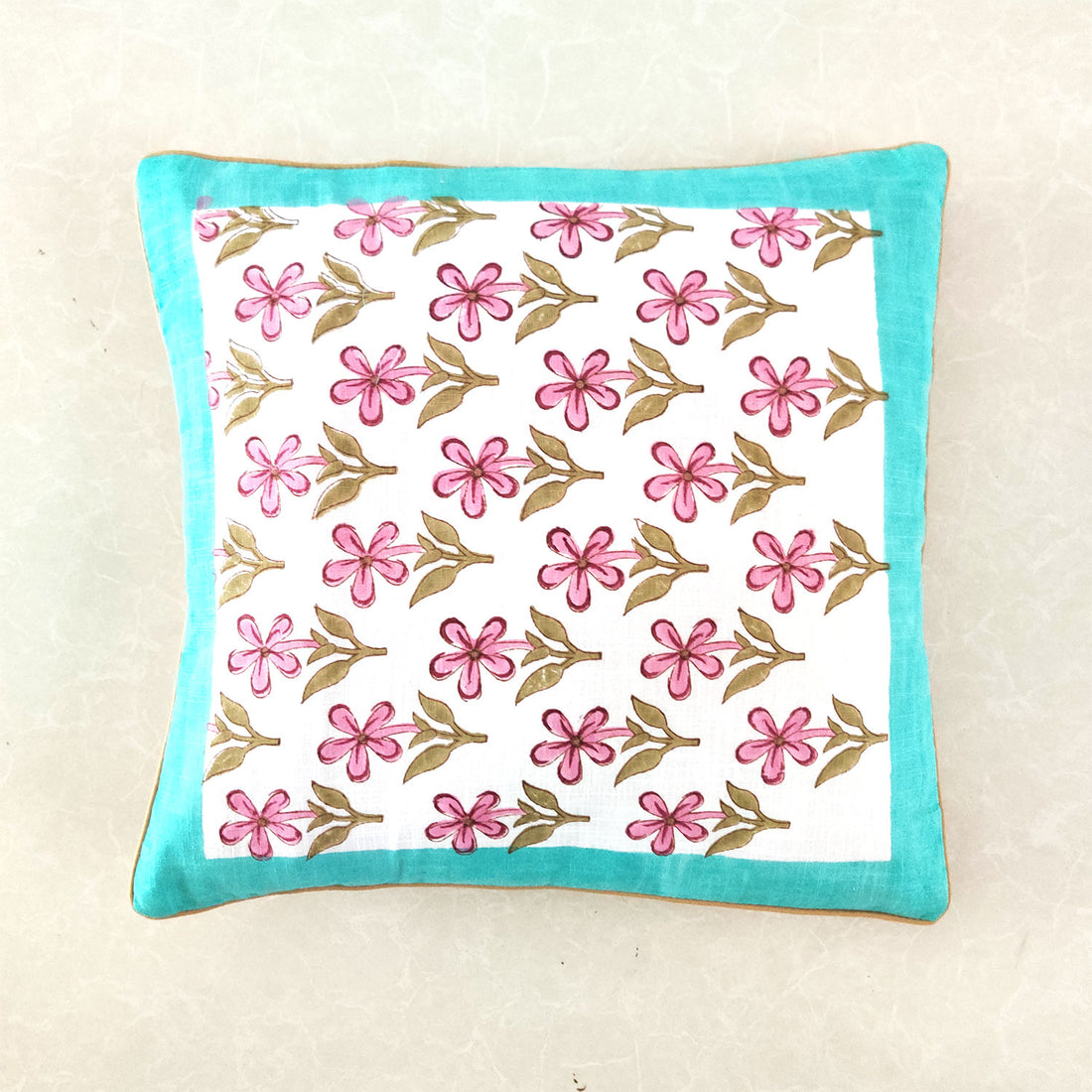 Pink Floral & White Block Printed 100% Cotton Slub Cushion Cover - 16 x 16 inches