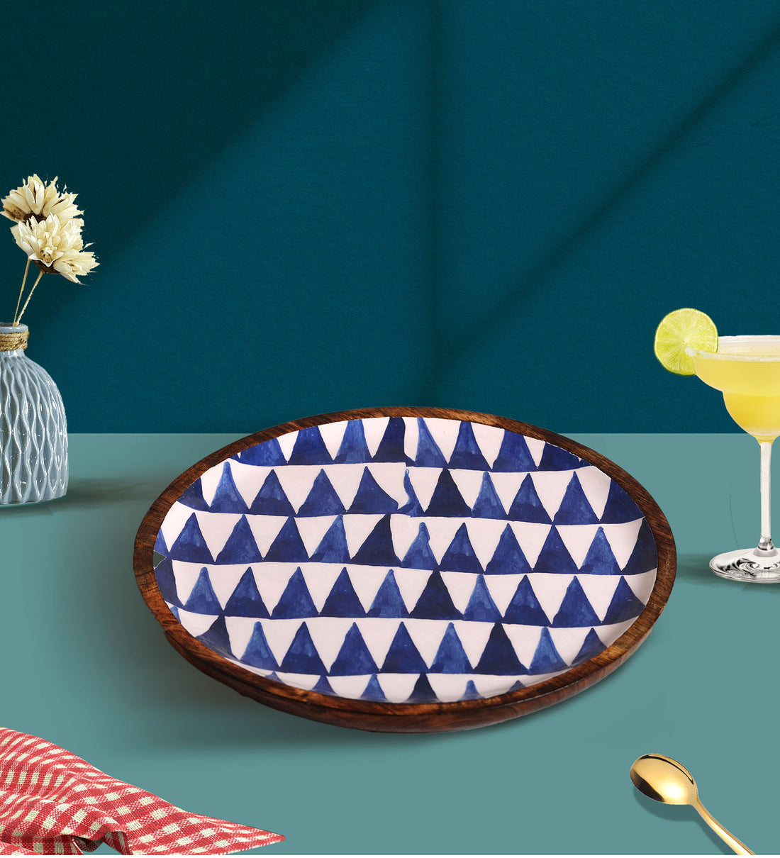 Boho Triangles Blue & White Round Mango Wood Platter With Enamel Finish | Peacoy