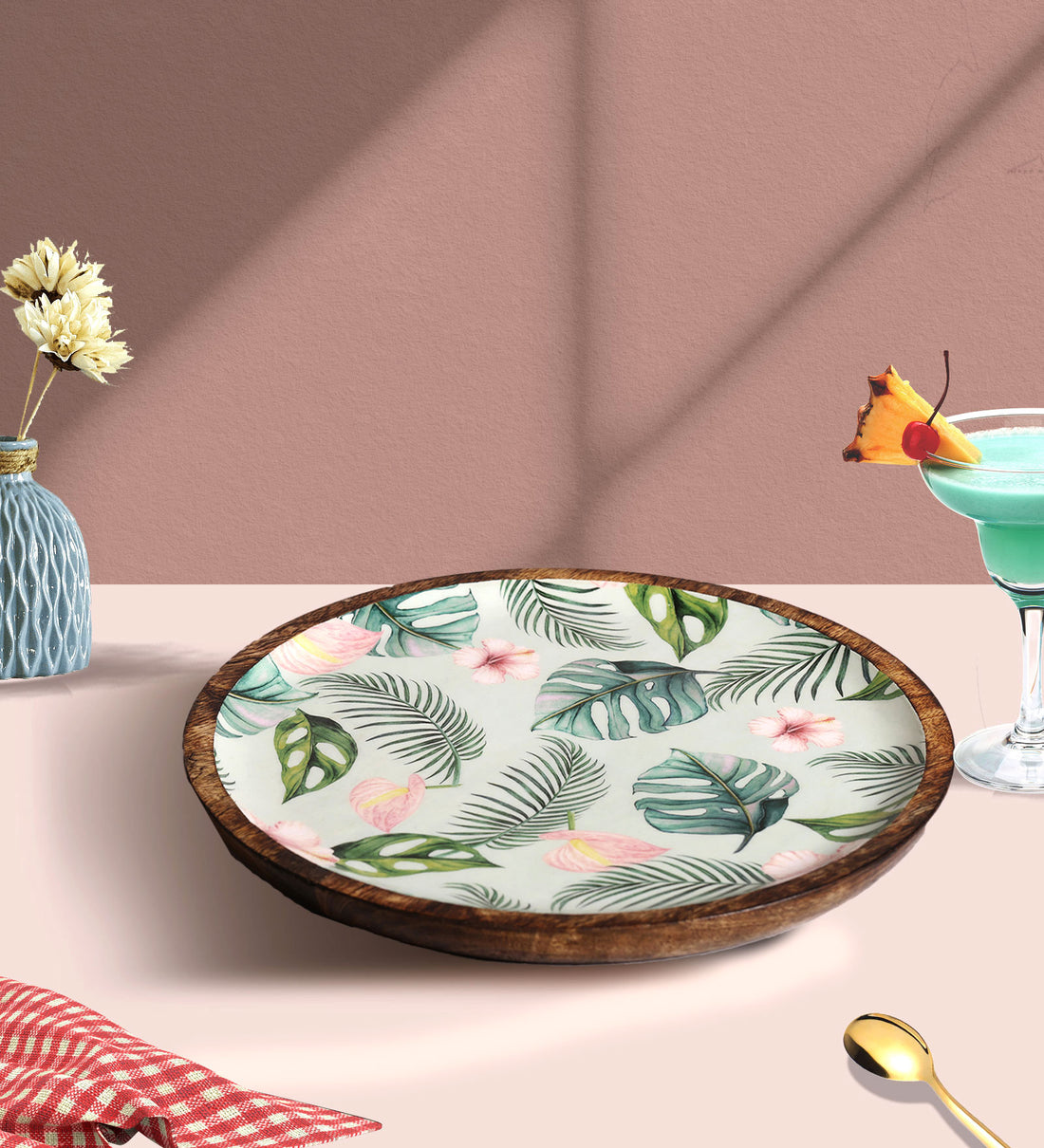 Tropical Vibes Round Mango Wood Platter With Enamel Finish | Peacoy