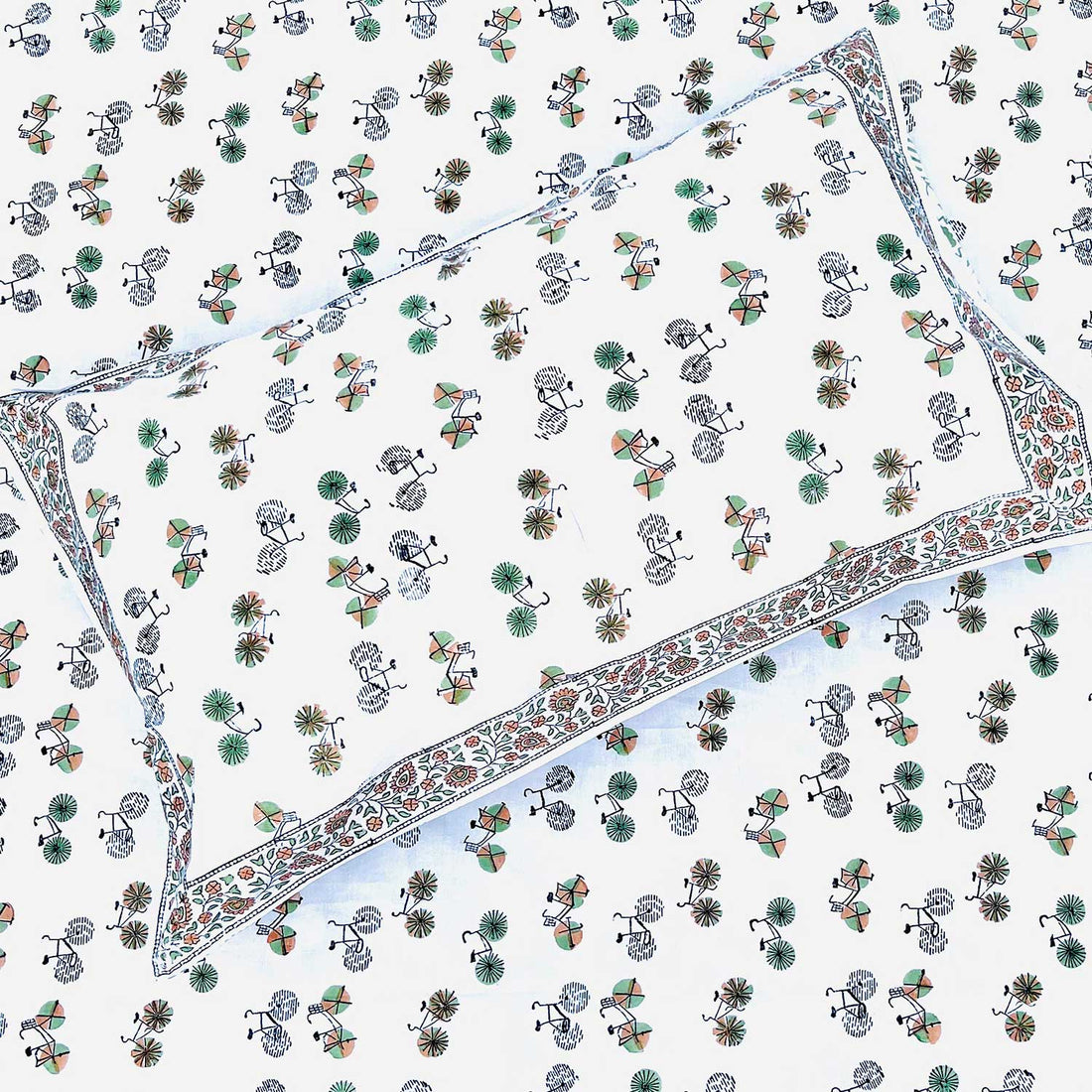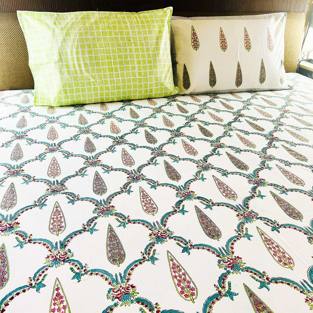 White and Green Jaal Block Printed Cotton Bedsheet 108x108 Inches