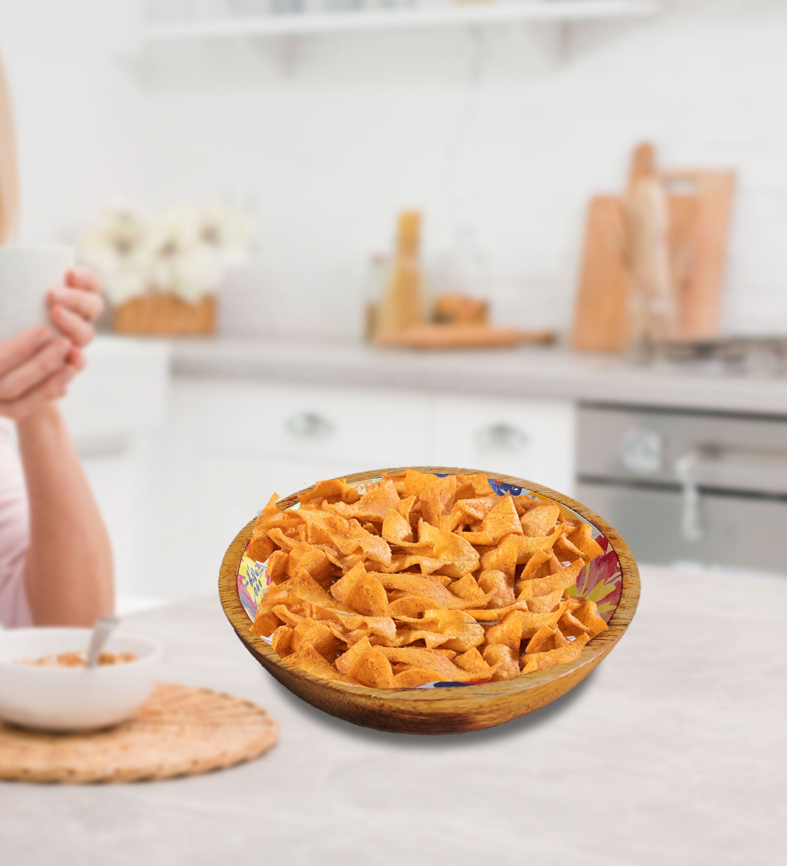 Flaunting a lovely floral design, this mango wood salad bowl emits a charm of its own. The design spreads sweetness and brings a smile to the face. Crafted from mango wood, this sustainable salad bowl is durable and food-safe.