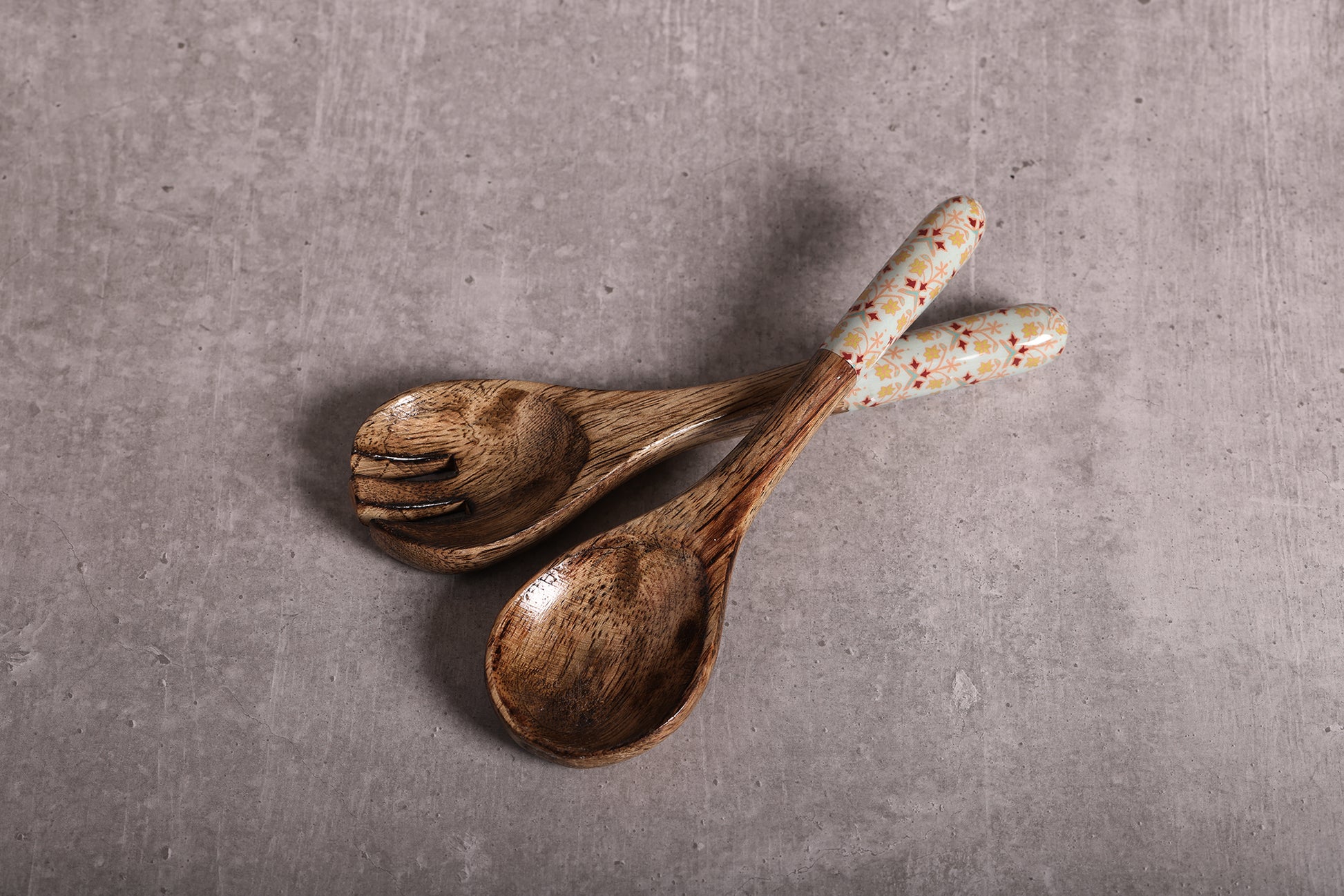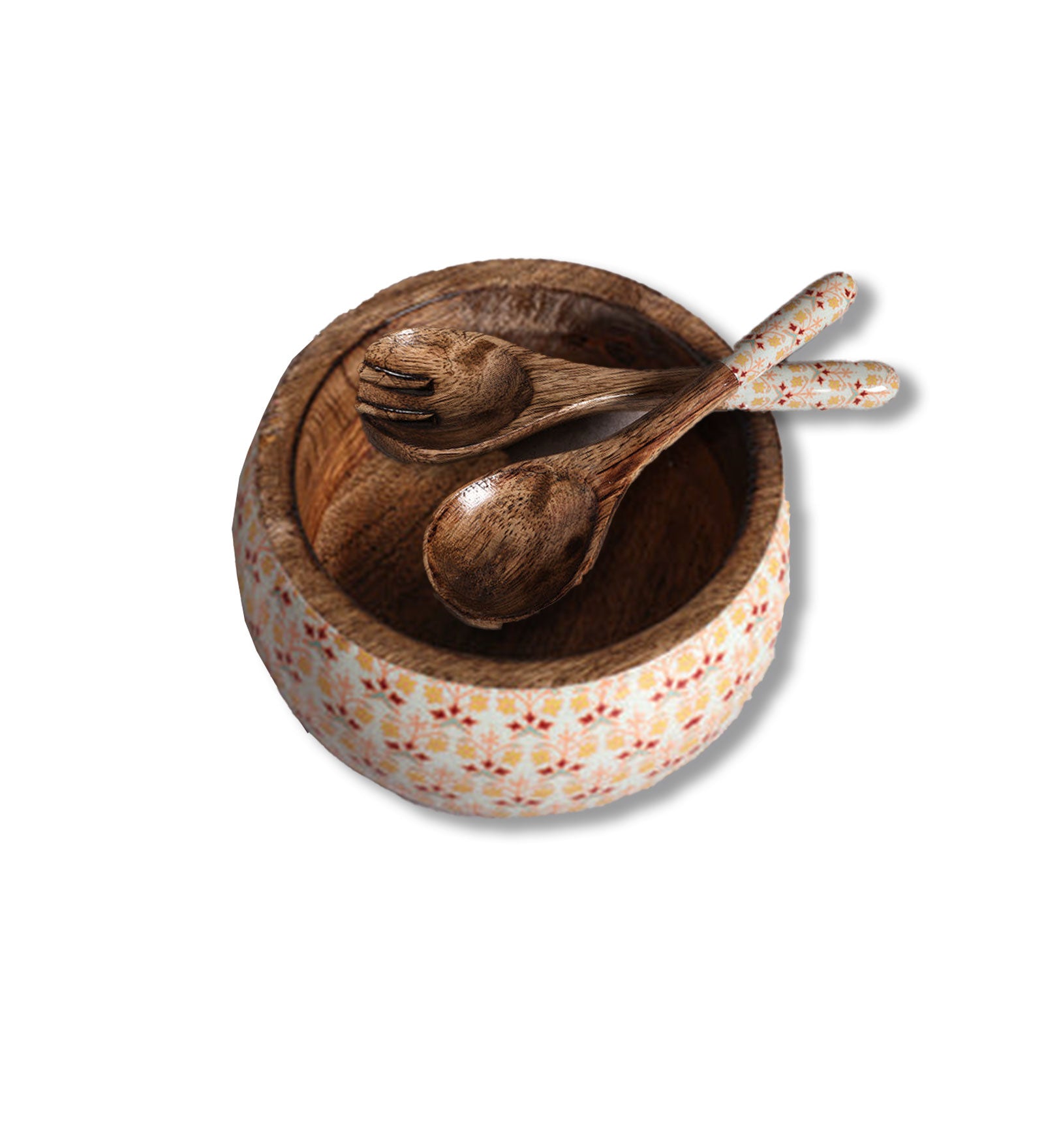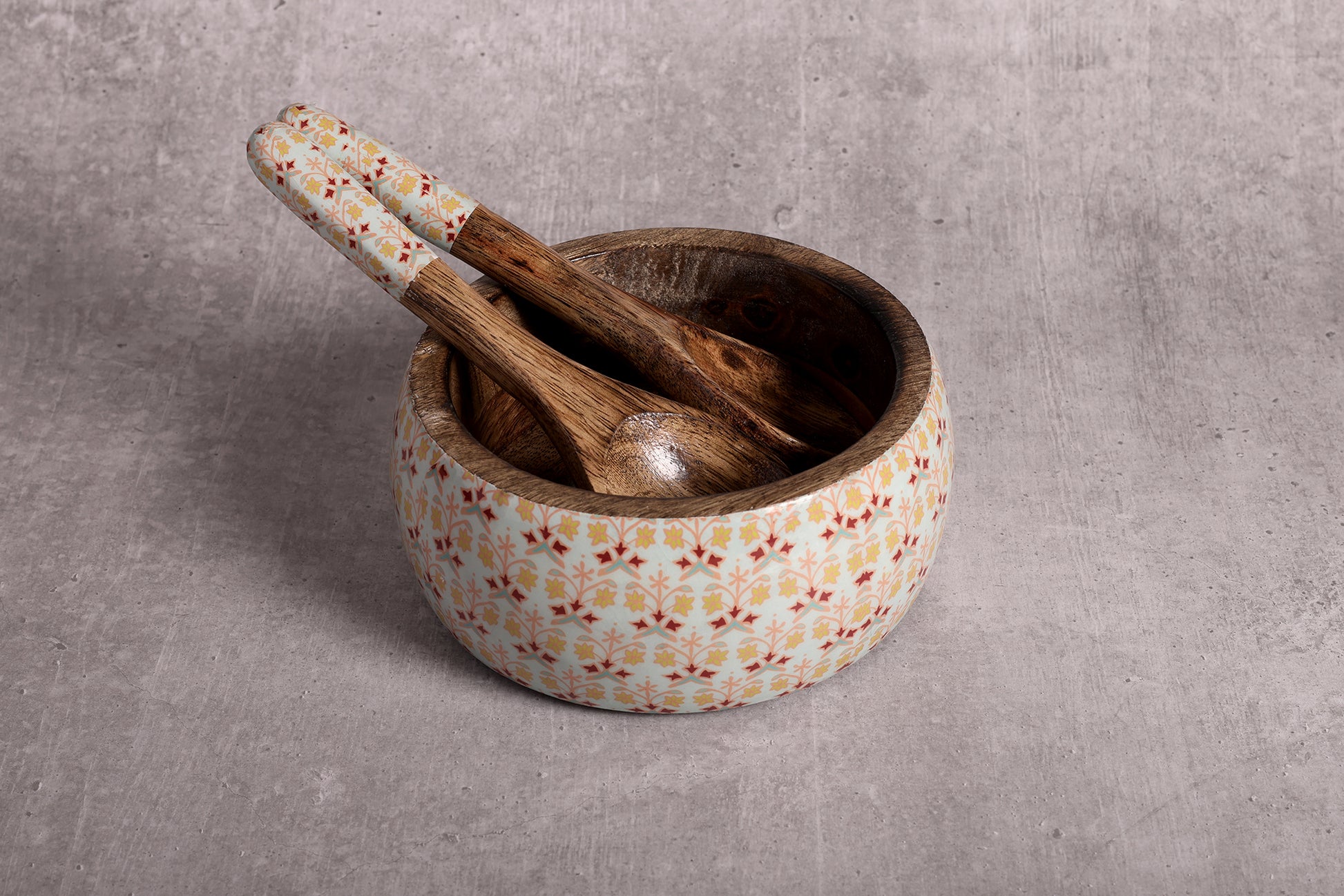 Artistic Florals Mango Wood Salad Bowl with Server Set - 500 g | Peacoy