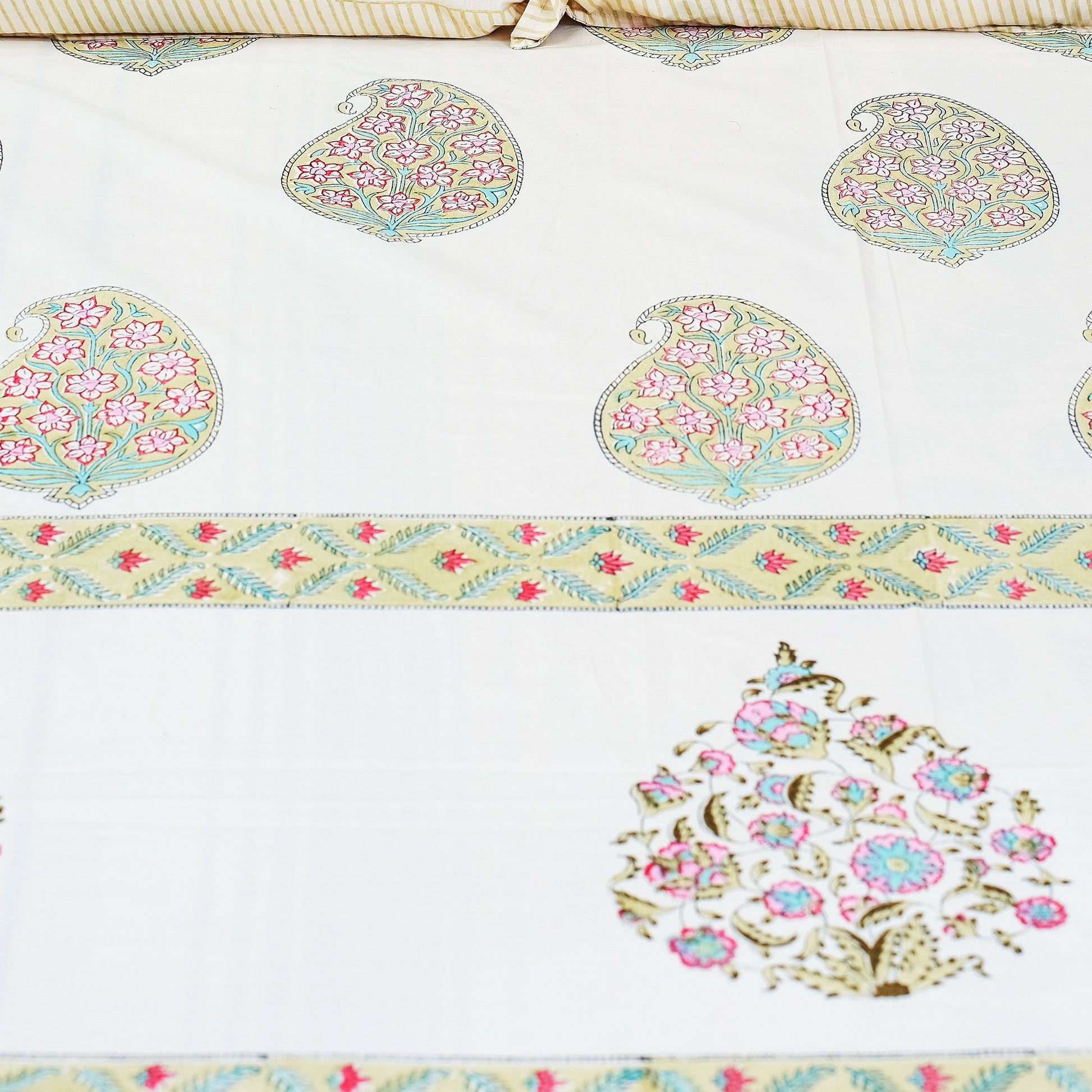 Valley of Flowers White Block Printed 210 Thread Count Cotton Double Bedsheet Set With 2 Pillow Covers - (90 inches x 100 inches)