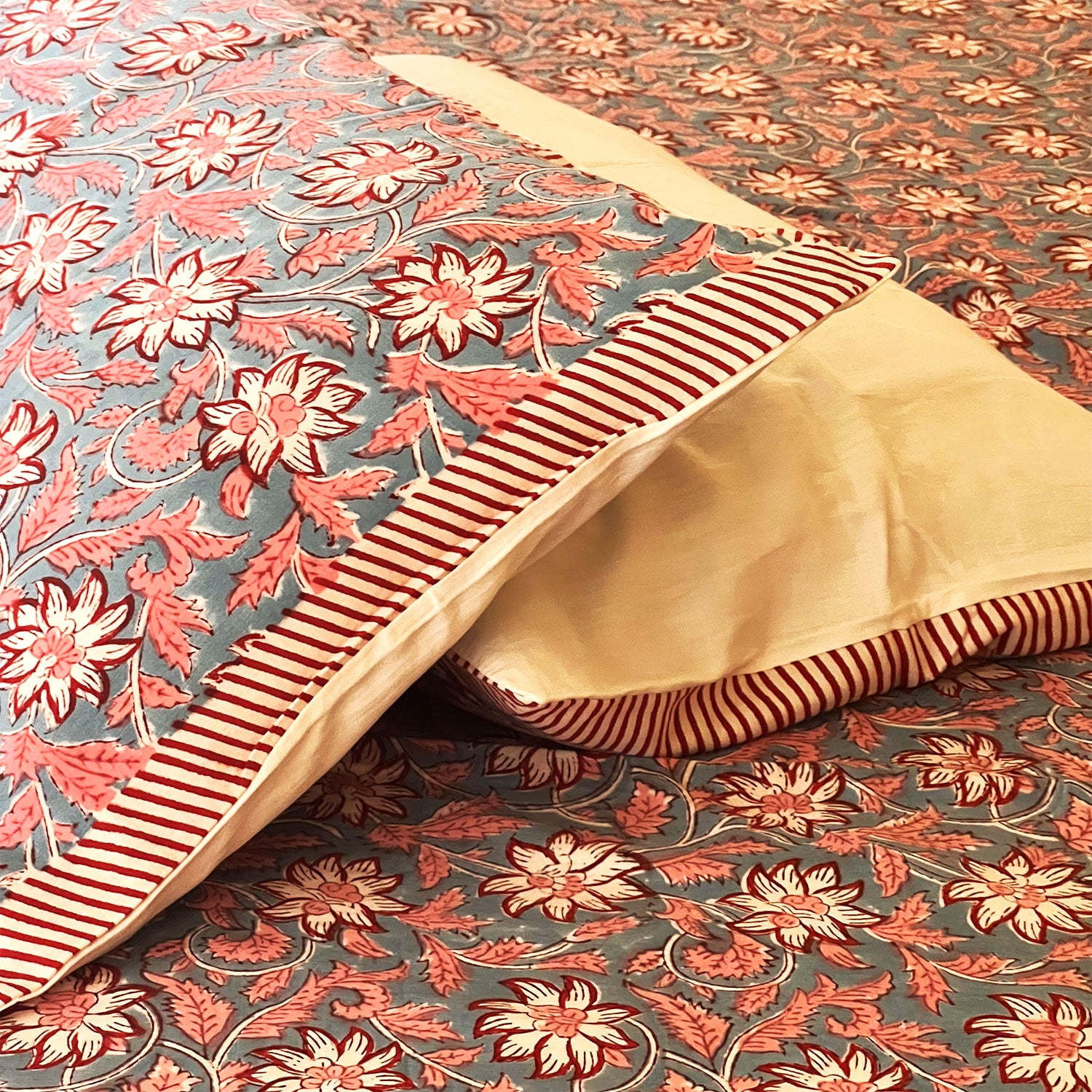 Delightful as a bouquet, our cotton bedsheet is easy to fall in love with. Made of the finest qualities of pure cotton, our bedsheet is soft and comfortable, equipped to give you a night of comfort. When spread out in your bedroom, it shows a refined taste. Block printed with craft and care, our 100% pure cotton bedsheet use azo-free dye, which is safe for the environment and you. Experience a feeling of clean luxury with our cotton bedsheet with two pillow covers.