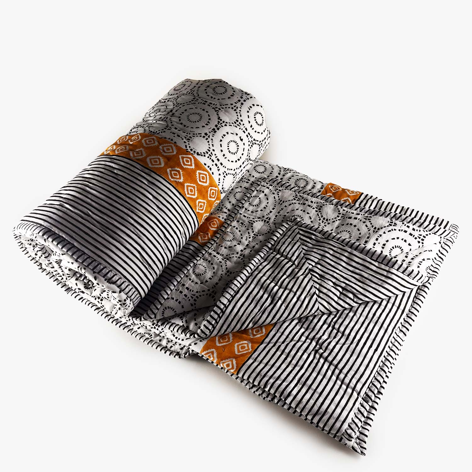 Black Strip Double Sided Block Printed Cotton Quilt Single 60x90 Inches