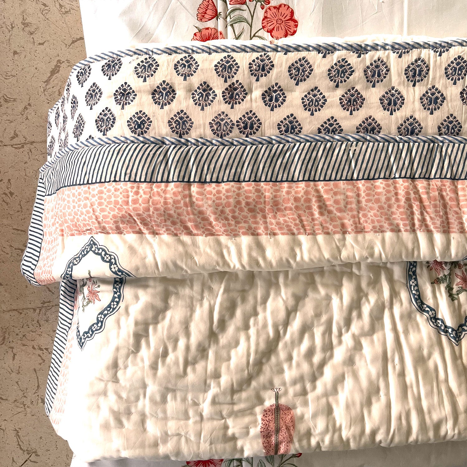 Bring the softness of nature and the charm of wildflowers to your home with block printed quilt. pure mumul, dohar with flannel sandwiched. Experience a cozy nap while at the same time revamping your bedroom. With a block-printed design and an azo-free dye, this lightweight quilt will add green allure to your room.