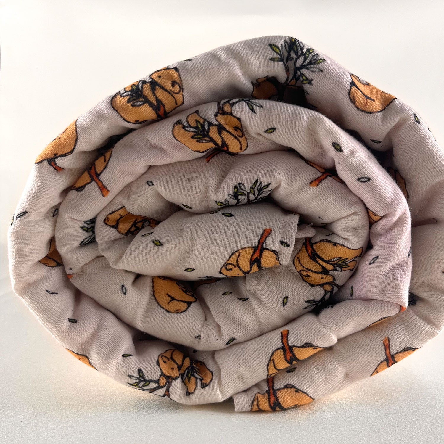 Bring the softness of nature and the cuteness of Giraffe to your home with block printed quilt. Made of pure cotton and voile fabric (mulmul), and stuffed with surgical cotton, it will tuck you into luxurious comfort. Experience a cozy nap while at the same time revamping your bedroom. With a block-printed design and an azo-free dye, this lightweight quilt will add green allure to your room.