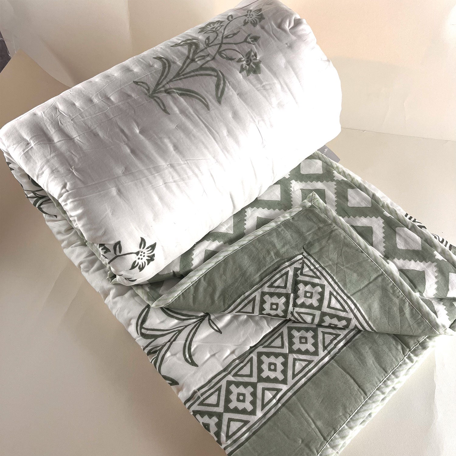 Olive Green Floral Soft Cotton Printed Single Bed Quilt - 60 inches x 90 inches