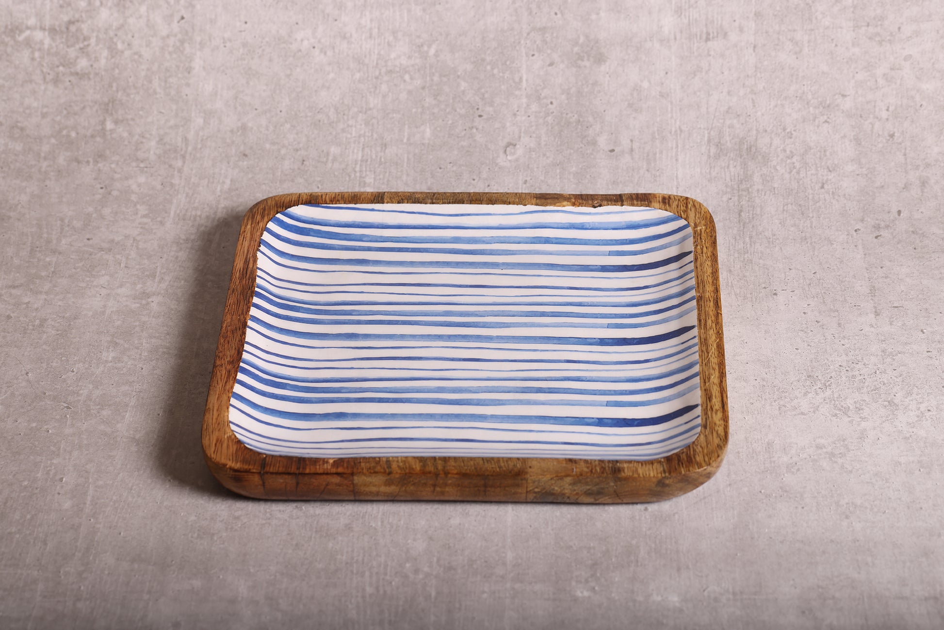 Stripe Love Blue Mango Wood Square Platter With Enamel Finish - 10 x 10 inches | Peacoy