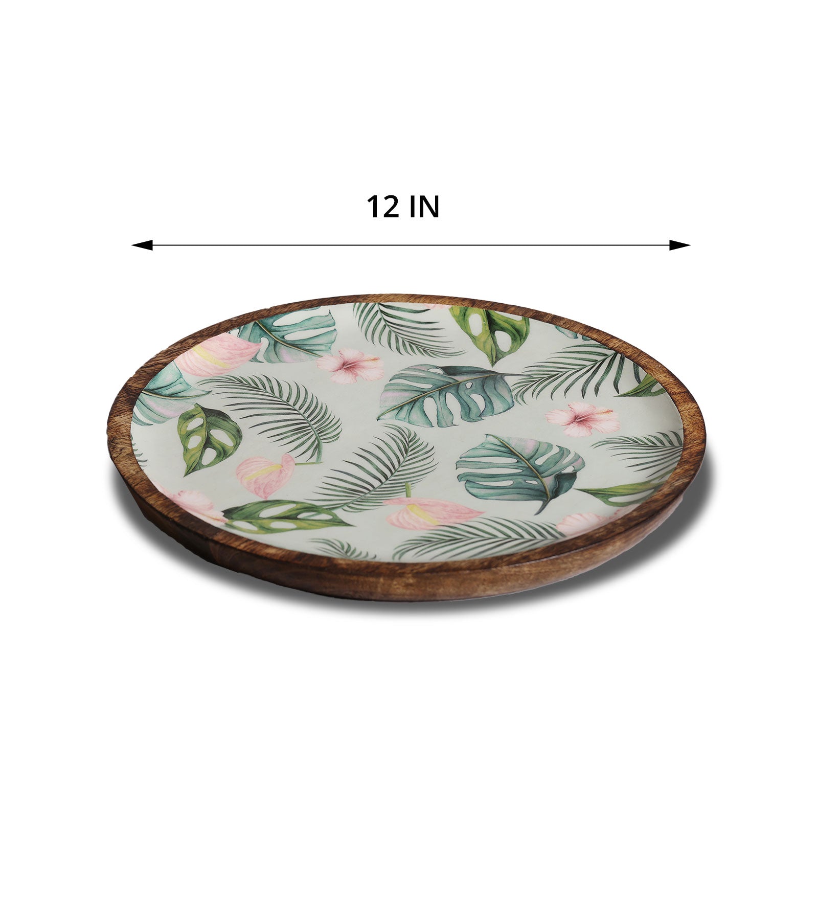 Trees, breeze and leaves; this round mango wood platter takes you on a tropical vacation. The refreshing tropical print is given an enamel finishing, rendering it exceptional visual quality.