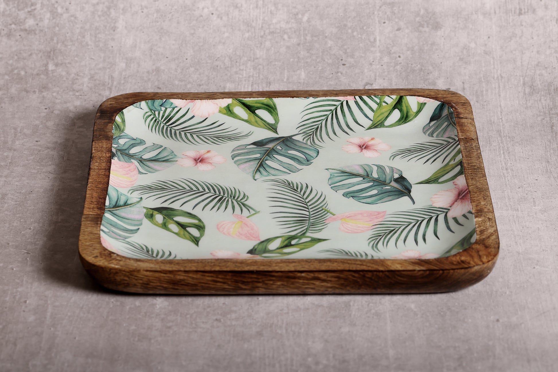 Trees, breeze and leaves; this square mango wood platter takes you on a tropical vacation. The refreshing tropical print is given an enamel finish, which renders it exceptional visual quality. Delicious desserts and mouth-watering bites, this platter complements them all.