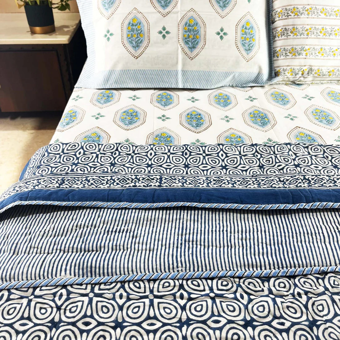Delightful as a bouquet, our cotton bedsheet is easy to fall in love with. Made of the finest qualities of pure cotton, our bedsheet is soft and comfortable, equipped to give you a night of comfort. When spread out in your bedroom, it shows a refined taste. Block printed with craft and care, our 100% pure cotton bedsheet use azo-free dye, which is safe for the environment and you. Experience a feeling of clean luxury with our cotton bedsheet with two pillow covers.