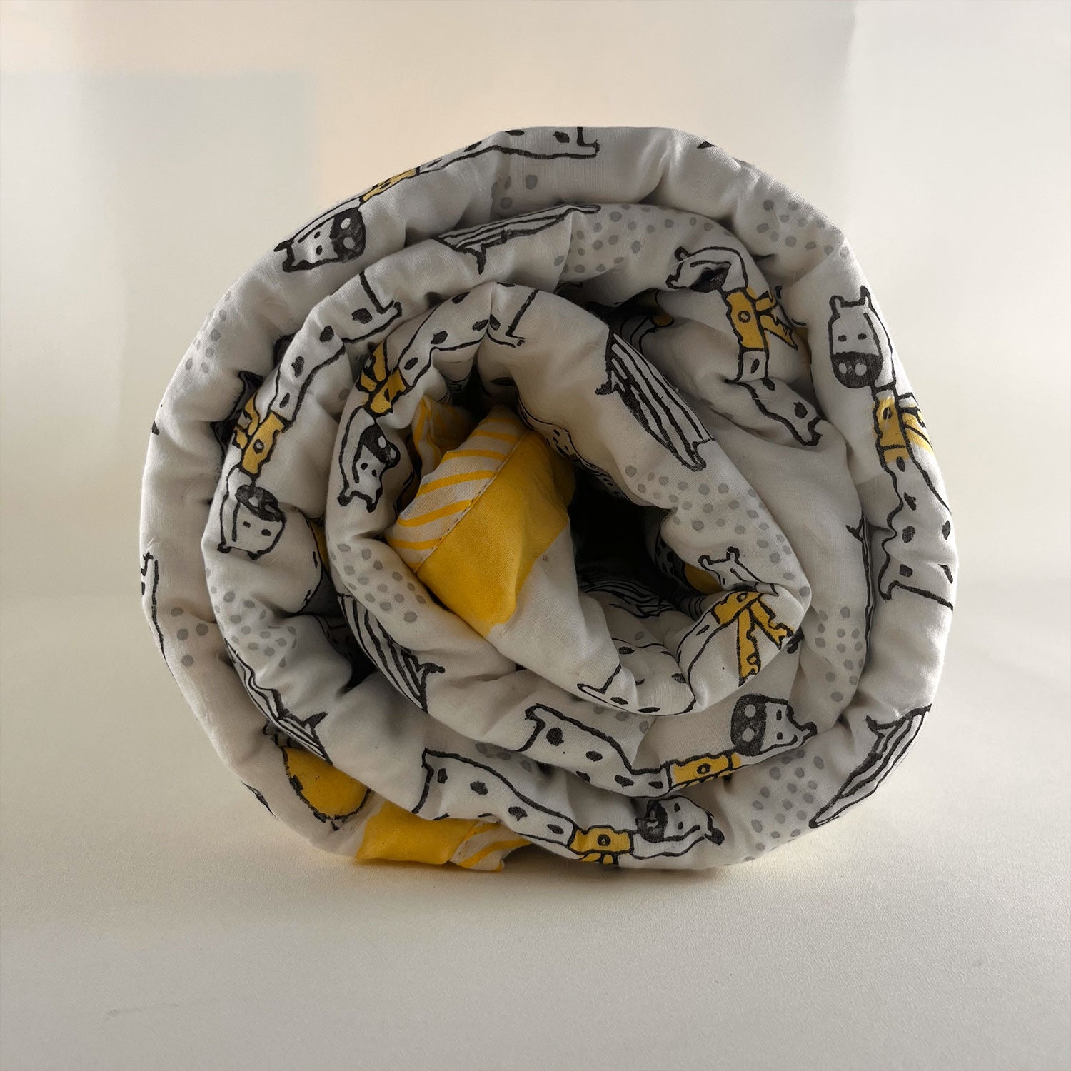Yellow Grey animals doodle Prints Kids Single Quilt | Single Sided | 40x60 Inches