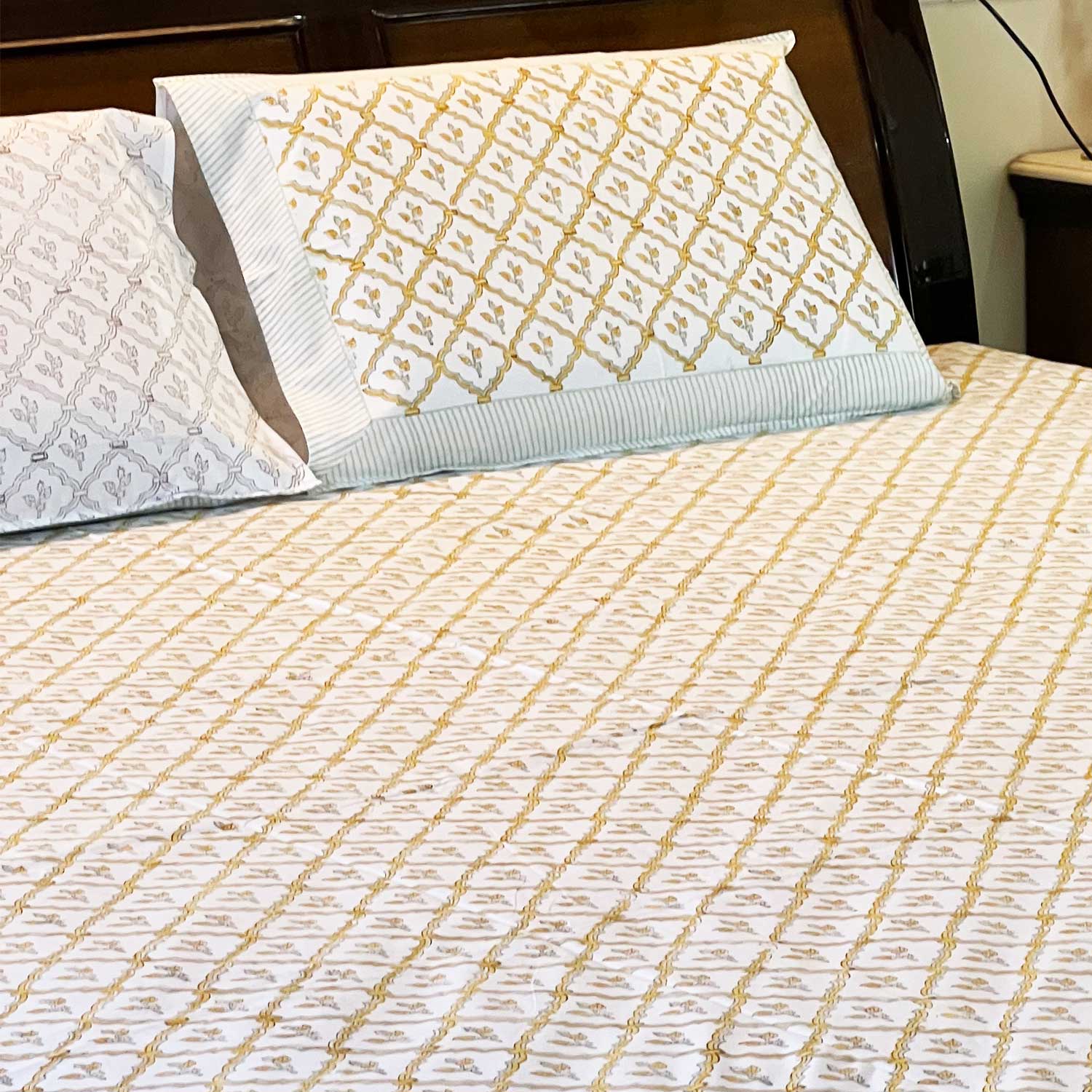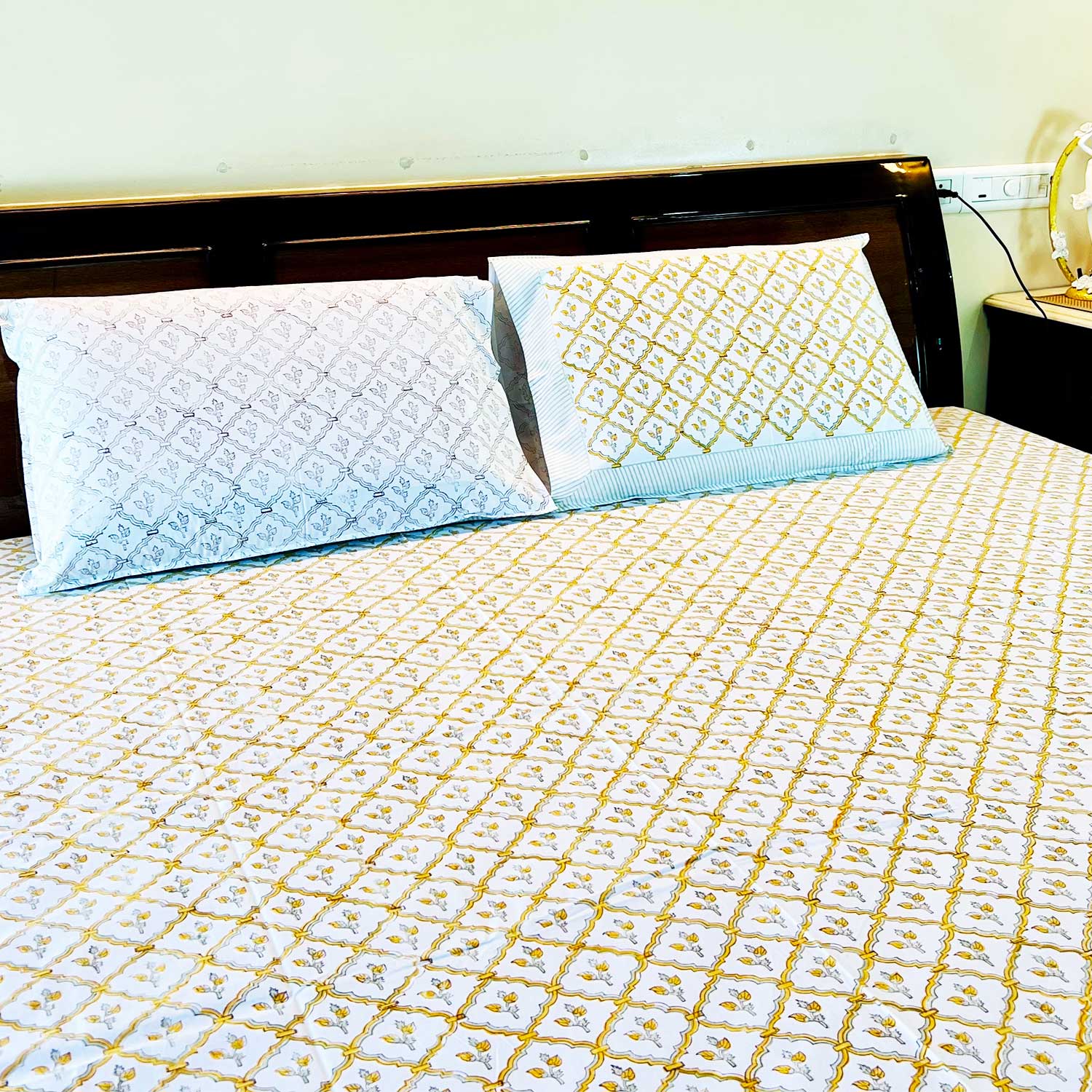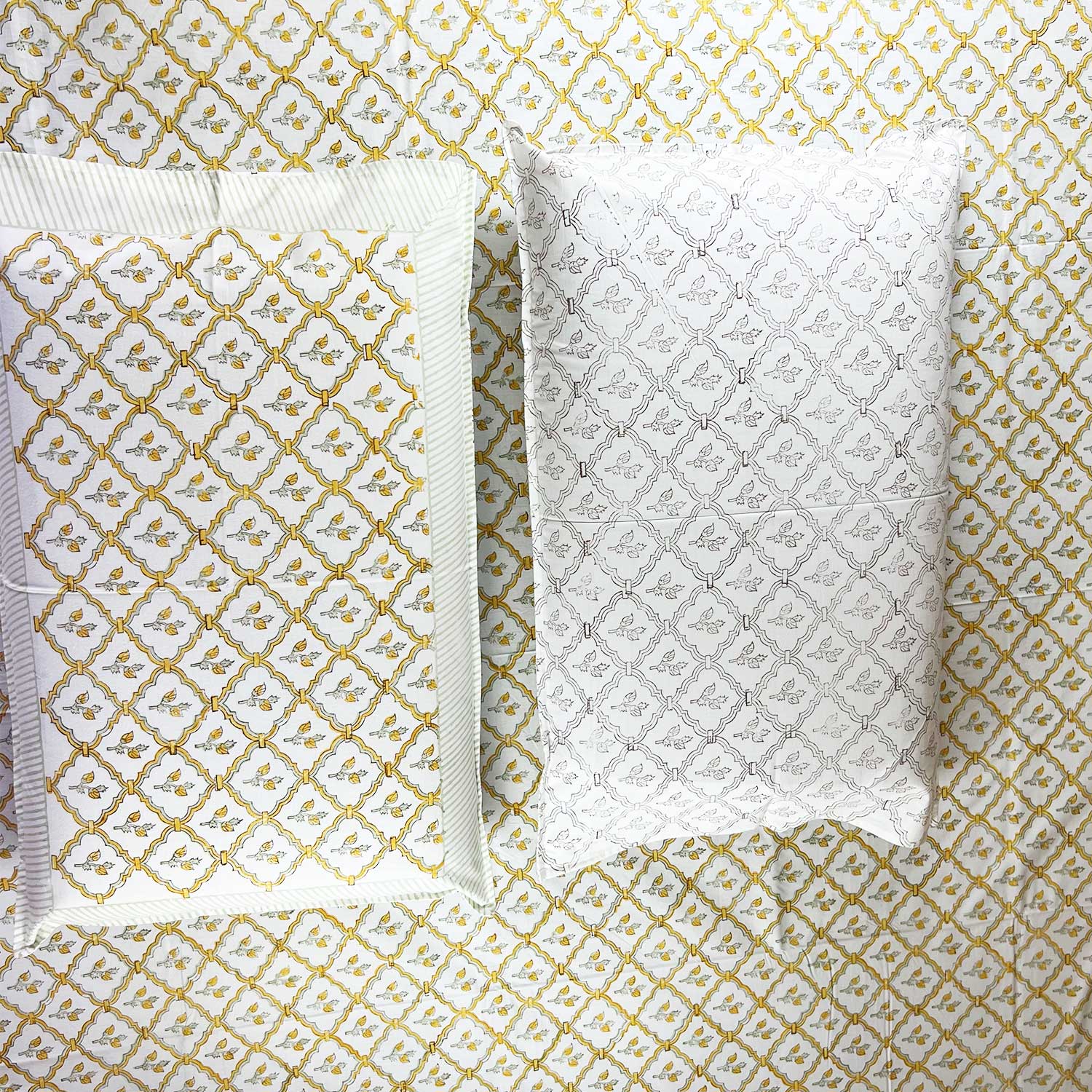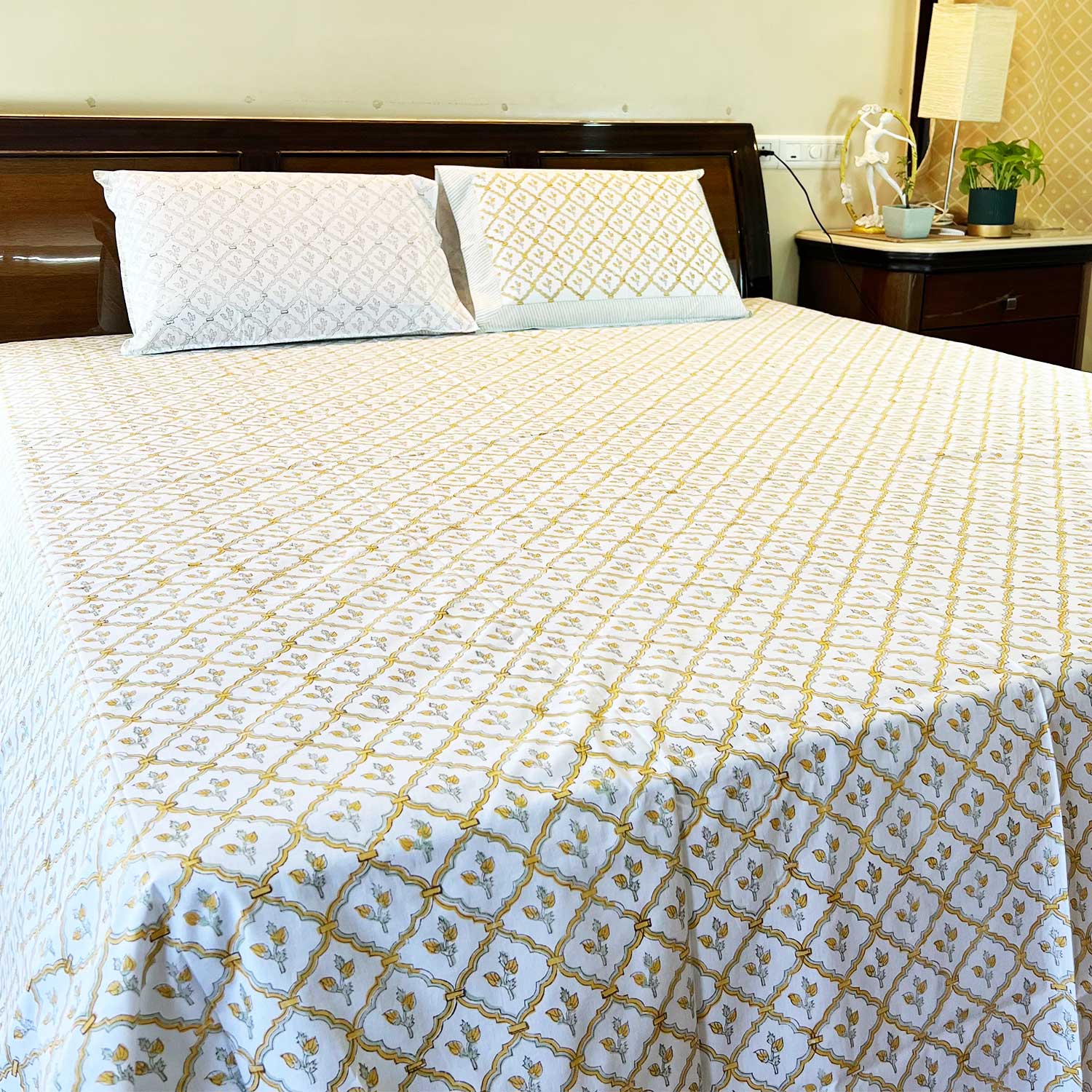 Delightful as a bouquet, our cotton bedsheet is easy to fall in love with. Made of the finest qualities of pure cotton, our bedsheet is soft and comfortable, equipped to give you a night of comfort. When spread out in your bedroom, it shows a refined taste. Block printed with craft and care, our 100% pure cotton bedsheet use azo-free dye, which is safe for the environment and you. Experience a feeling of clean luxury with our cotton bedsheet with two pillow covers.